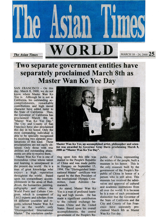 Master Wan Ko Yee (H.H. Dorje Chang Buddha III), an accomplished artist, philosopher and scientist was awarded by Governor Gray Davis proclaiming March 8, 2000 as “Master Wan Ko Yee (H.H. Dorje Chang Buddha III) Day”.